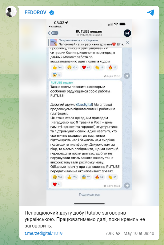 "Неработающий вторые сутки Rutube заговорил по-украински. Будем работать дальше, пока Кремль не заговорит", - написал он.