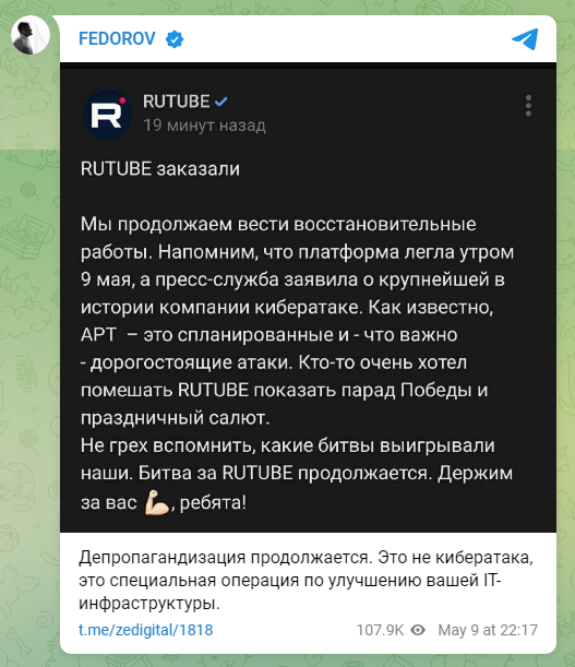 09:05 Министр цифровой трансформации Михаил Федоров прокомментировал сбой в работе российского видеохостинга Rutube, который произошел 9 мая из-за DDoS-атаки. Его глава Минцифры назвал "специальной операцией по улучшению IT-инфраструктуры".