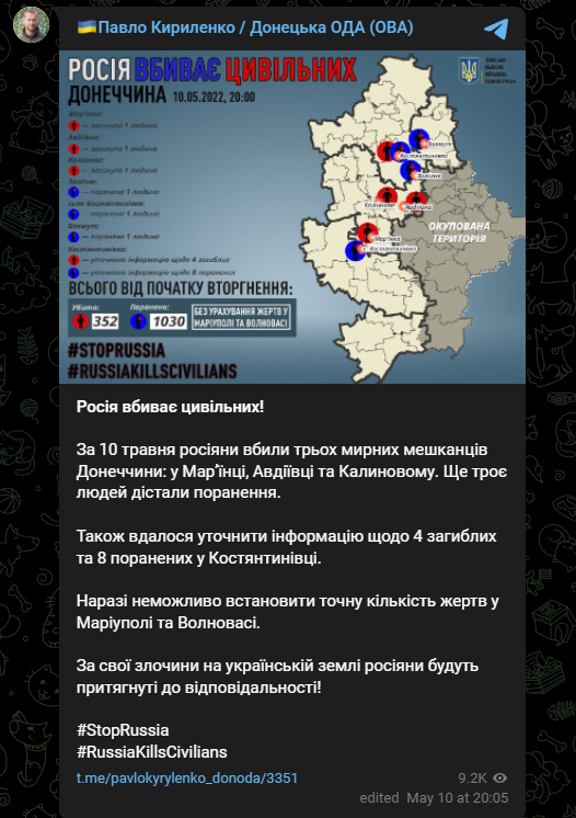 "Также удалось уточнить информацию о 4 погибших и 8 раненых в Константиновке. В настоящее время невозможно установить точное количество жертв в Мариуполе и Волновахе. За свои преступления на украинской земле россияне будут привлечены к ответственности!" - написал Кириленко в своем Телеграм-канале.