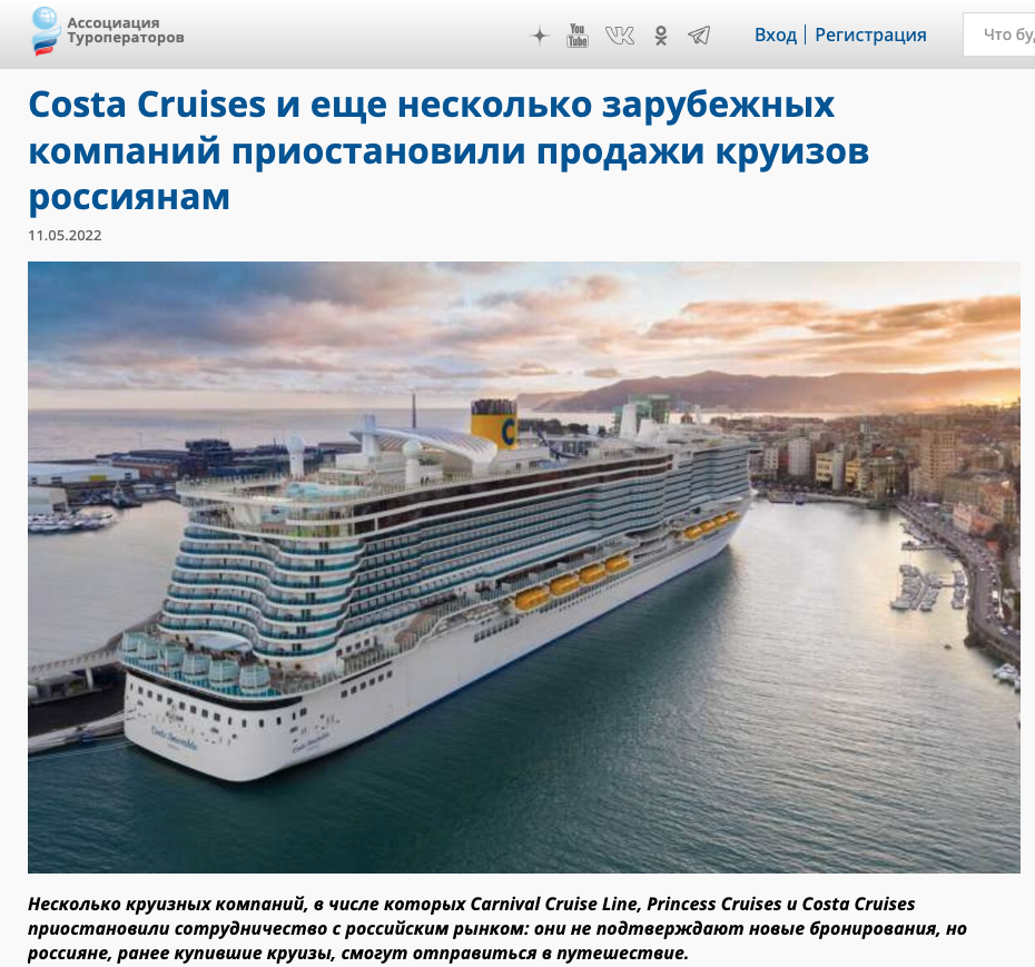 В частности, продажи для россиян закрыли Carnival Cruise Line, Princess Cruises, Cunard Line, Quark Expeditions, Holland America Line Cruises, Regent Seven Seas Cruises и Seabourn Cruise Line.