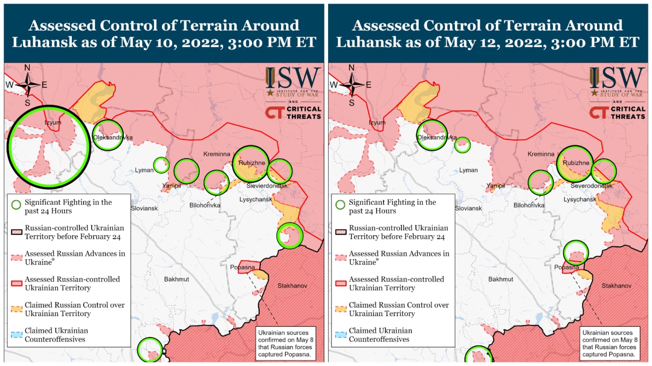 1. Российские войска немного продвинулись на севере от Северодонецка и, вероятно, захватили Рубежное и Воеводовку.