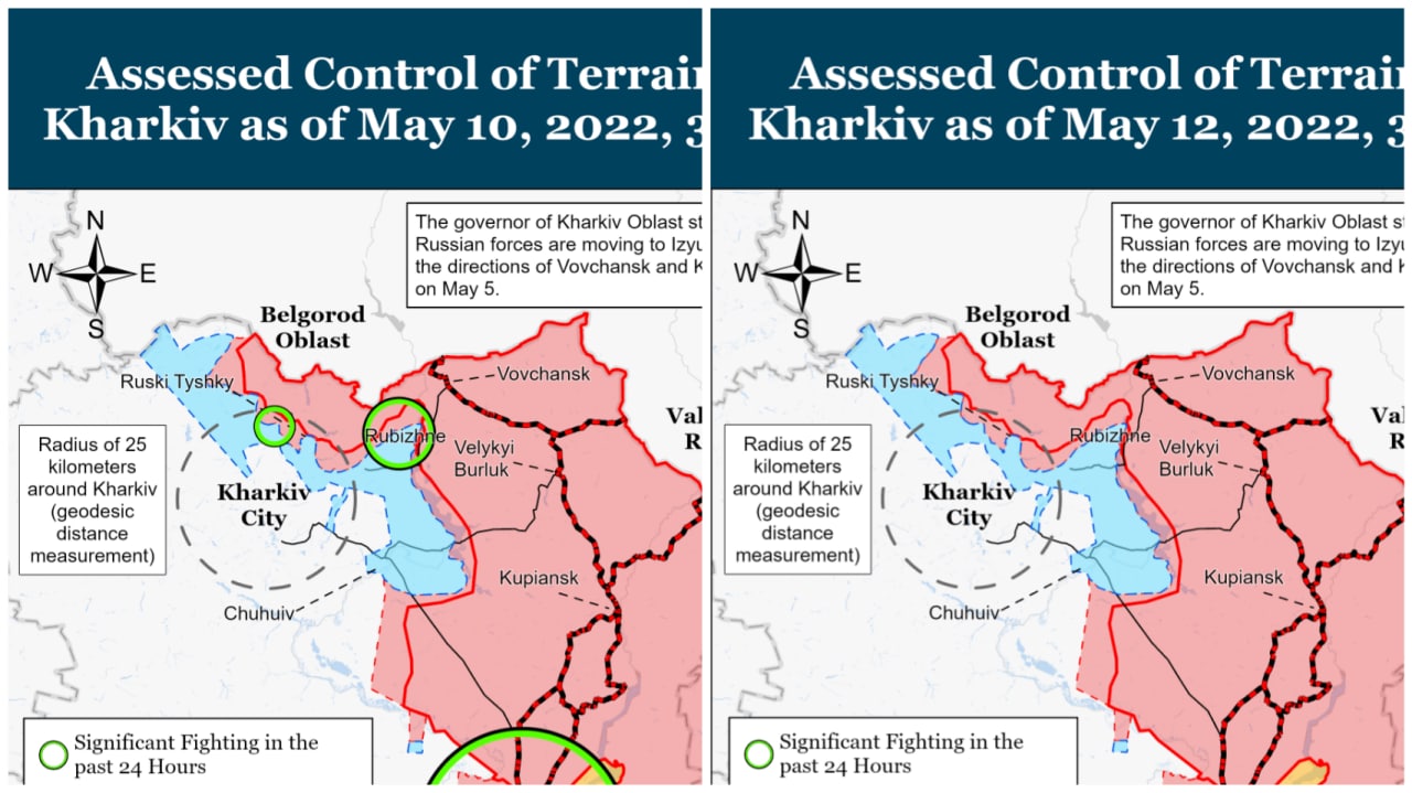 Существенных подвижек контрнаступления под Харьковом, судя по картам, не прослеживается. "Ни российские, ни украинские силы не совершали никаких подтвержденных наступлений в северной части Харьковской области за последние 24 часа", - говорится в заявлении "Института".