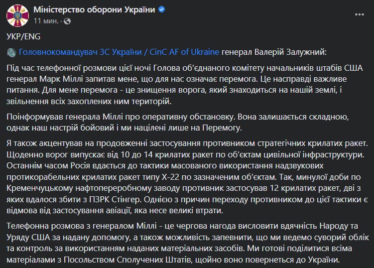 Одновременно с тем появилось сообщение о переговорах главнокомандующего ВСУ Валерия Залужного с главой объединенного комитета наальников штабов США Марком Милли.