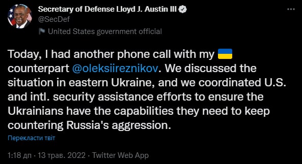 "Сегодня у меня был очередной телефонный разговор с моим украинским коллегой. Мы обсудили ситуацию на востоке Украины, и мы координировали действия США и международного сообщества. усилия по оказанию помощи в обеспечении безопасности, чтобы у украинцев были возможности, необходимые им для продолжения противодействия агрессии России", - написал он.