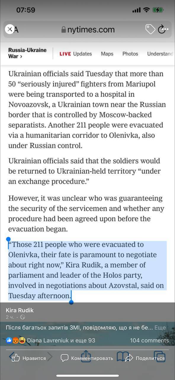 Об этом она сказала в комментарии The New York Times. В публикации ее представили, как депутата, "вовлеченного в процесс переговоров по "Азовстали".
