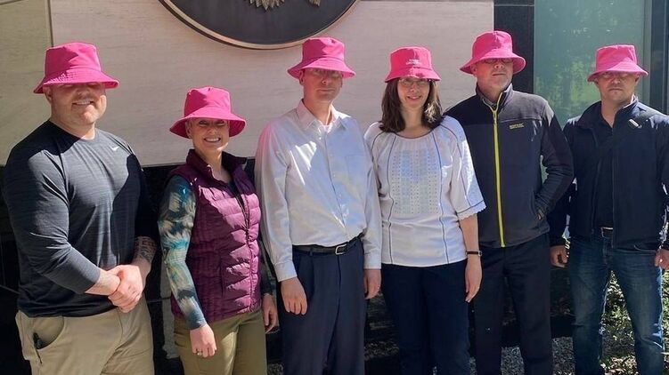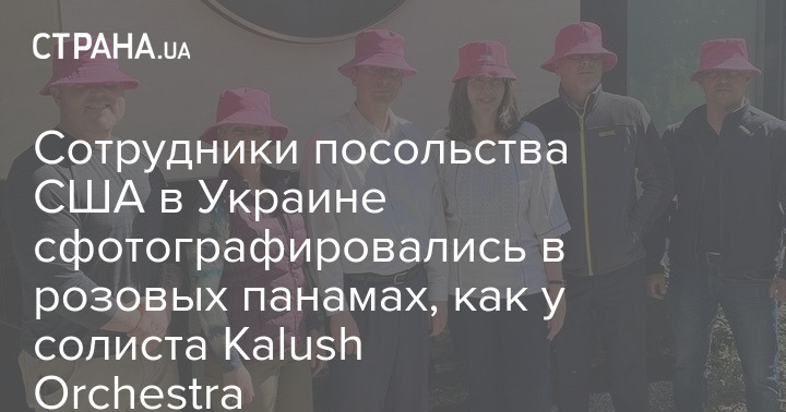 Вернувшиеся в Киев сотрудники посольства США сфотографировались на фоне своего здания, надев точно такие же головные уборы, как у лидера Kalush Orchestra на Евровидении.