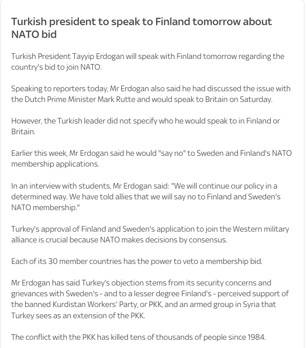 Как известно, Турция обещает блокировать вступление Швеции и Финляндии в НАТО и выдвинула свои пять условий. Основная претензия Анкары - это якобы поддержка Швецией "Рабочей партии Курдистана", которых Турция считает террористами.