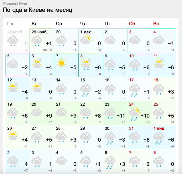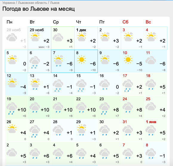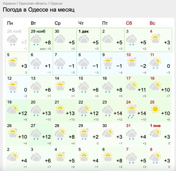В этом плане на руку будет довольно теплая погода — сильных морозов не ожидается. Напротив, во второй половине декабря холодов вовсе не прогнозируется. Столбики термометров в Киеве, Харькове, Львове будут подниматься днем до +10, а в Одессе — до +14.