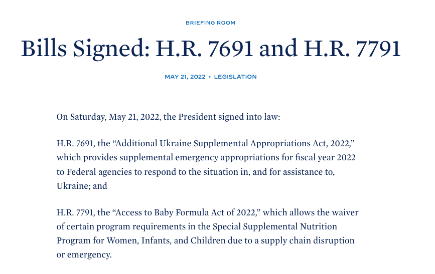 "Президент подписал закон HR 7691, "Закон о дополнительных ассигнованиях в Украину на 2022 год", который предусматривает дополнительные чрезвычайные ассигнования на 2022 финансовый год федеральным агентствам для реагирования на ситуацию в Украине и для оказания помощи", - говорится в сообщении.