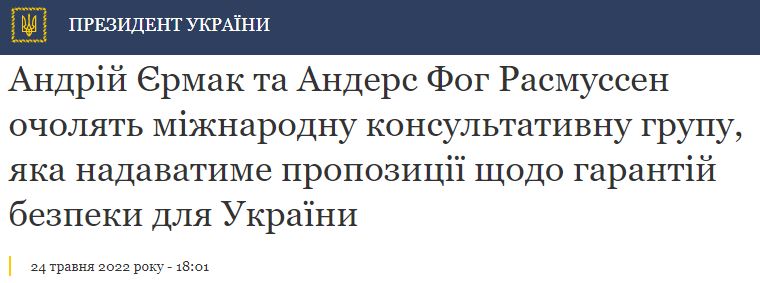 Предложения по гарантиям безопасности для Украины теперь будет разрабатывать международная консультативная группа, которую возглавят глава Офиса Президента Украины Андрей Ермак и экс-генеральный секретарь НАТО Андерс Фог Расмуссен.