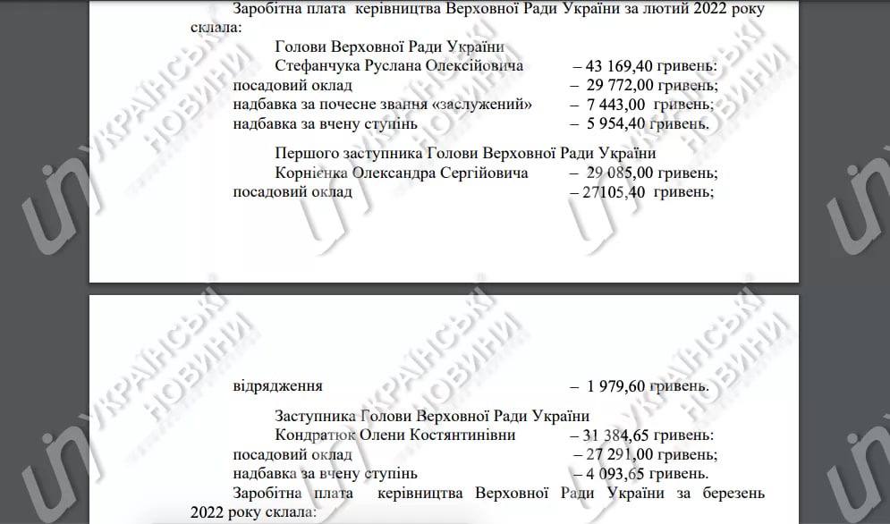 Также сообщается, что заработная плата главы ВР Руслана Стефанчука за 3 месяца работы с февраля по апрель составила 135 тысяч гривен, его первого заместителя Александра Корниенко - 94 тысяч гривен, а заместителя председателя Елены Кондратюк – 96 тысяч гривен.