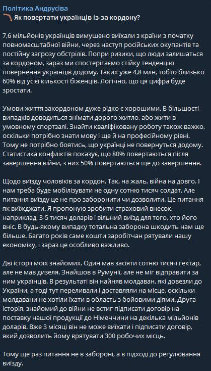 "Относительно выезда мужчин за границу. Да, к сожалению, война надолго. И нам нужно будет мобилизовать не одну сотню тысяч солдат. Но вопрос выезда это не запретить или разрешить. Это вопрос, как уезжать. Я предлагаю внести страховой взнос, например 3-5 тысяч долларов, и свободный выезд для того, кто его внес. В любом случае тотальный запрет вредит нам еще больше. Многие годы именно средства заробитчан спасали нашу экономику, и сейчас это особенно важно", - пишет Андрусив.