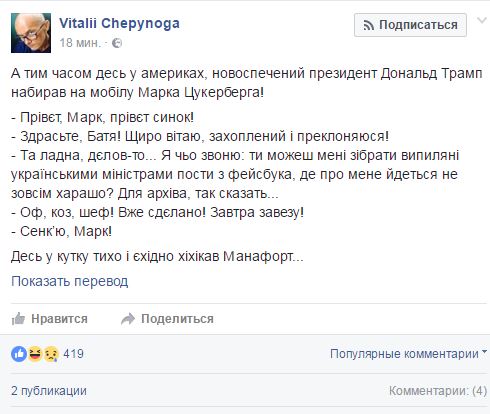 Министр внутренних дел Украины Арсен Аваков, после шквальной критики со стороны общественности и нардепов, вернул на свою страницу в социальной сети Facebook некомплиментарный пост о победителей выборов в США Дональде Трампе.