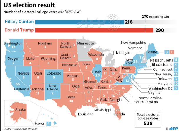 В США прошли 58-е президентские выборы. Их исход определяется не всеобщим голосованием по всей стране, а коллегией выборщиков и зависит от результатов голосования в каждом из 50 штатов и Вашингтоне. Для победы главным фаворитам гонки, Клинтон или Трампу, необходимо было заручиться голосами не менее 270 выборщиков из 538.