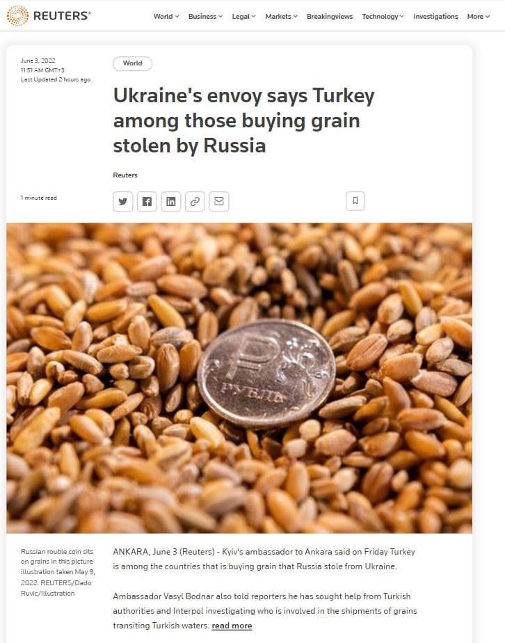 Дипломат обратился к властям Турции и в Интерпол с призывом расследовать, кто причастен к перевозке зерна транзитом через турецкие воды.