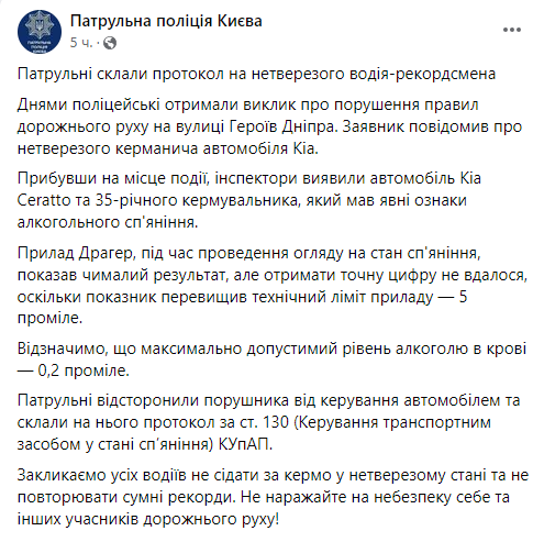 "Прибыв на место происшествия, инспекторы обнаружили автомобиль Kia Ceratto и 35-летнего водителя, имевшего явные признаки алкогольного опьянения. Патрульные отстранили нарушителя от вождения и составили на него протокол по ст. 130 (Управление транспортным средством в состоянии опьянения) КУоАП", - говорится в сообщении.