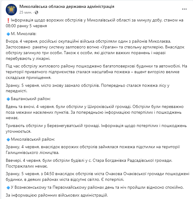 "Утром 5 июня, с 04:50 в результате обстрелов города Очакова Очаковской громады повреждены дома, в некоторых районах города отсутствует свет. Есть потерпевшие", - говорится в сообщении администрации.