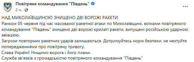 "Две ракеты сбиты противовоздушной обороной. С направления Черного моря и с территории России крылатыми ракетами воздушного базирования атаковано черноморское побережье Николаевщины, порты и зернохранилища", - заявляет командование.