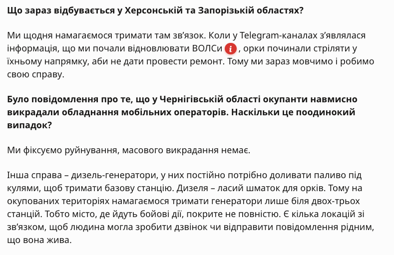 "Мы каждый день стараемся держать там связь. Когда в Telegram-каналах появлялась информация, что мы начали восстанавливать ВОЛСы (волоконно-оптические линии связи - Ред.), орки начинали стрелять в их направлении, чтобы не дать провести ремонт. Поэтому мы сейчас молчим и делаем свое дело", – рассказала Ольга Устинова.
