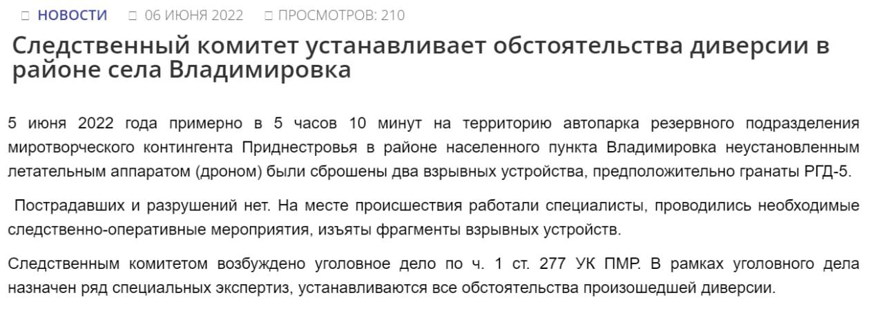 В Приднестровье снова неспокойно. В "следственном комитете ПМР" заявили, что рано утром беспилотник атаковал подразделение миротворцев в районе села Владимировка.