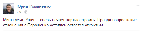 Аналитик Украинского Института Будущего Юрий Романенко дал прогноз о перспективах грузинского политика в Украине: "Миша усьо. Ушел. Теперь начнет партию строить. Правда вопрос какие отношения с Порошенко остались остается открытым", - отметил Романенко на своей странице в Facebook.