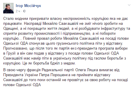 Соратники Ляшко по партии уверены, что Саакашвили за обвинениями президента в коррупции удачно скрывает свое бездействие на посту губернатора Одесской области. Так, радикал Игорь Мосийчук требует от президента не принимать отставку Михо, пока он не отчитается о проделанной работе и успешных реформах.