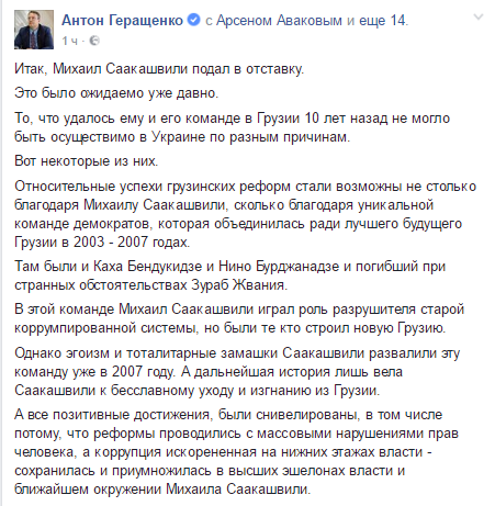 Народный депутат Антон Геращенко считает, что отставка Саакашвили - вполне ожидаема по причине того, что грузинские реформы не смогли прижиться в украинских реалиях. Именно из-за краха правления губернатор решил уйти.
