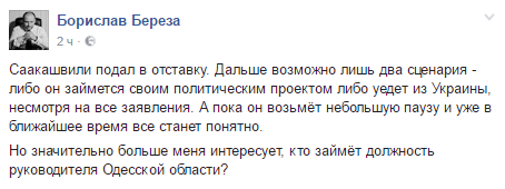 Внефракционный депутат Борислав Береза уверен, что отставка Саакашвили - это своеобразная пауза. По его мнению, возможно 2 сценария развития событий - собственный политический проект либо отъезд из Украины.