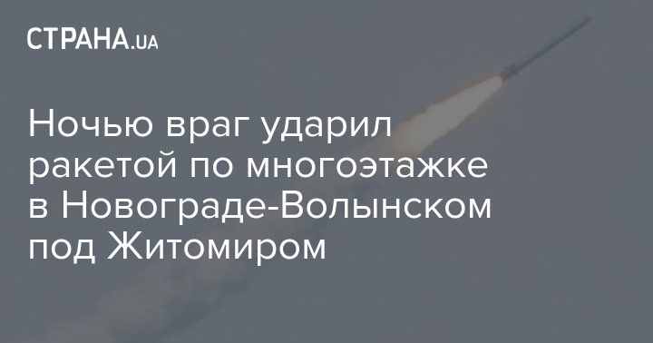 В ночь на четверг, 9 июня, враг снова нанес удар по Житомирской области. Около часа российская ракета разрушила многоэтажное здание в Новограде-Волынском. Пока информации о погибших и пострадавших нет. На месте происшествия работают правоохранители.