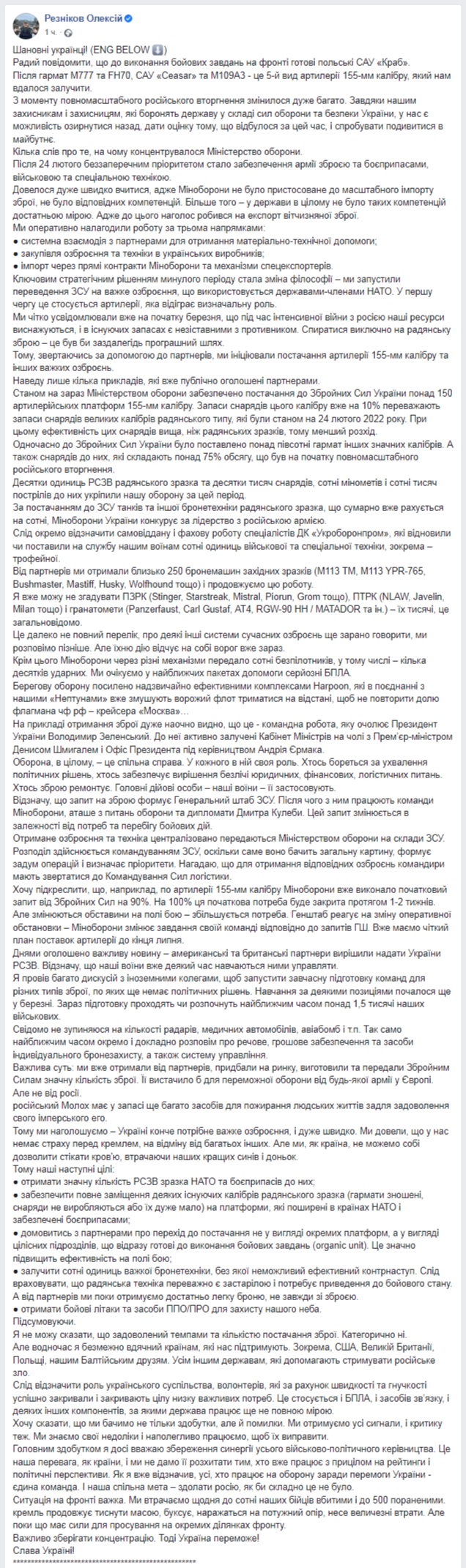 Министр обороны заявил, что категорически не удовлетворен темпами и количеством вооружения, поставляемого Украиной, но в то же время выразил благодарность странам, которые поддерживают Украину.