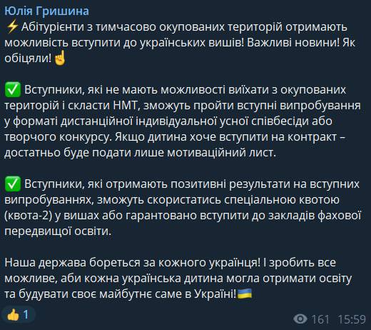 Абитуриенты с оккупированых территорий могут поступить в украинские ВУЗы посредством "дистанционного индивидуального устного собеседования или творческого конкурса". Об этом сообщает глава подкомитета ВР по вопросам высшего образования Юлия Гришина у себя в Facebook.