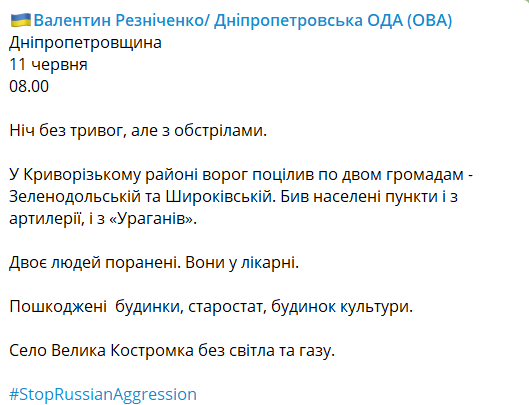 "Днепропетровщина. 11 июня. Ночь без тревог, но с обстрелами. В Криворожском районе враг попал по двум общинам – Зеленодольской и Широковской. Били по населенным пунктам и артиллерией, и "Ураганами". Два человека ранены. Они находятся в больнице. Повреждены дома, старостат, здание культуры. Село Большая Костромка без света и газа", – написал Резниченко.