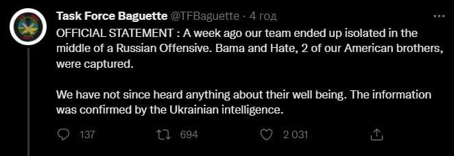"Неделю назад наша команда оказалась в изоляции посреди русского наступления. Бама и Хейт, двое наших американских братьев, попали в плен. С тех пор мы ничего не слышали о них. Информацию подтвердила украинская разведка", - говорится в сообщении.