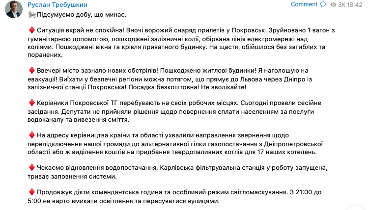 "Выехать в безопасные регионы можно поездом, который следует во Львов через Днепр с железнодорожной станции Покровская! Посадка бесплатная! Не медлите!", - призывает Требушкин.