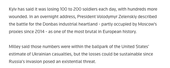 "В СМИ мы видим сообщения о том, что Украина теряет в сутки 100 человек убитыми и 100, 200 или 300 человек ранеными. Я сказал бы, что это близко к нашим оценкам", — сказал Милли.