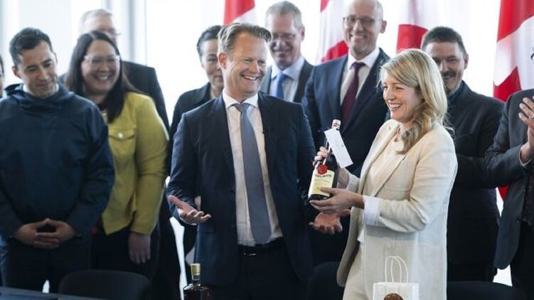 Главы МИД Дании и Канады обмениваются алкоголем. Фото: Justin Tang для globallookpress.com