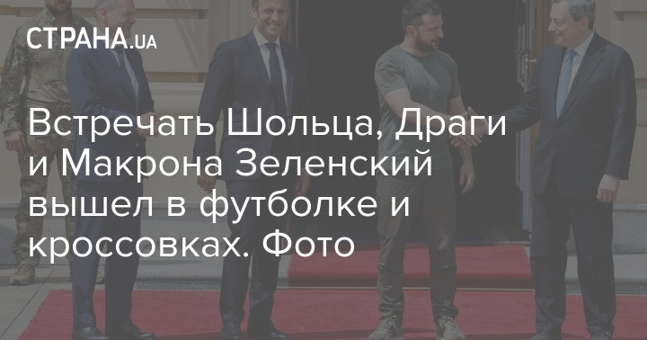 Также опубликовано фото, на котором Зеленский приветствует европейских гостей. Отметим, что Маркон, Шольц, а также итальянский премьер прибыли на официальную встречу в строгих костюмах и галстуках. А Зеленский, проигнорировав протокол, вышел к ним в футболке, брюках спортивного кроя и в кроссовках.