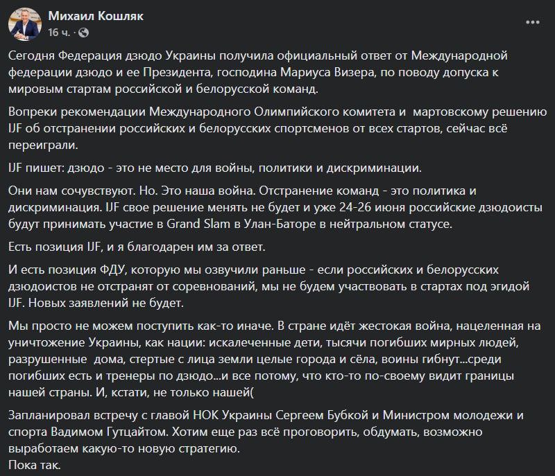 Об этом пишет глава Федерации дзюдо Украины Михаил Кошляк.