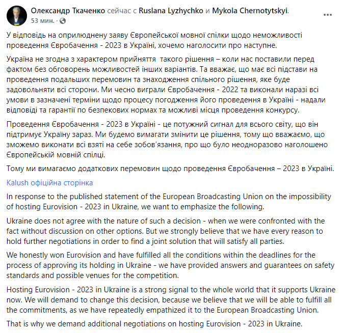 Глава Минкульта Александр Ткаченко заявил, что Украина не согласна с решением Европейского вещательного союза о невозможности проведения "Евровидения-2023" в нашей стране.