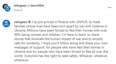 "Посол доброй воли УВКБ ООН Бен Стиллер находится сегодня на границе с Украиной, чтобы встретиться с семьями, чьи жизни были разлучены войной и насилием, поделиться историями о влиянии войны на человека и усилить призывы к солидарности", - говорится в сообщении.