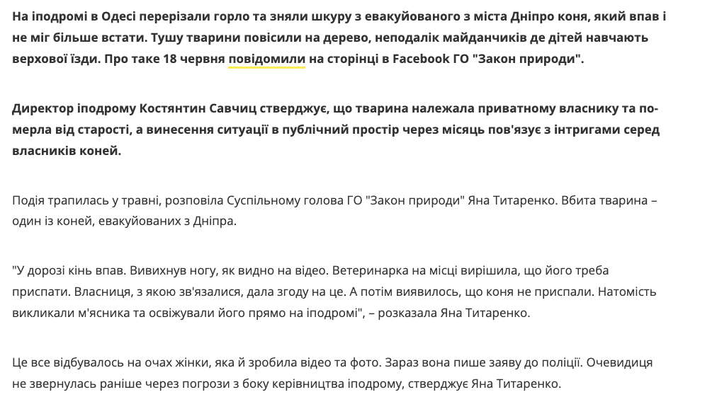 Убитое животное – одна из лошадей, эвакуированных из Днепра. "В дороге конь упал. Вывихнул ногу, как видно на видео. Ветеринарка на месте решила, что его нужно усыпить. Владелица, с которой связались, дала согласие на это. А потом оказалось, что коня не усыпили. Вместо этого вызвали мясника и освежевали его прямо на ипподроме", – рассказала Яна Титаренко.