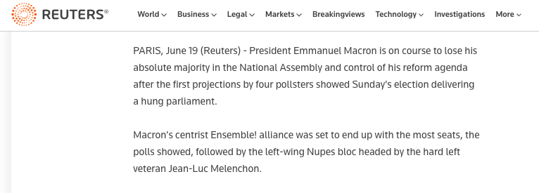 Однако партия Макрона получила менее 50%, таким образом потеряв монобольшинство в парламенте, где на прошлых выборах у них было 53%. Вероятно, Макрон не сможет также единолично сформировать правительство.