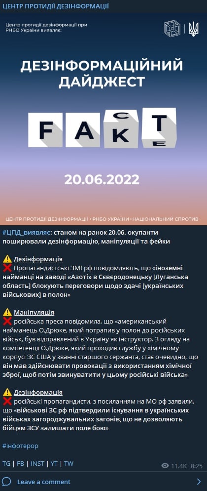 Центр противодействия дезинформации при СНБО косвенно подтверждает факт переговоров по эвакуации военных из "Азота" в Северодонецке.