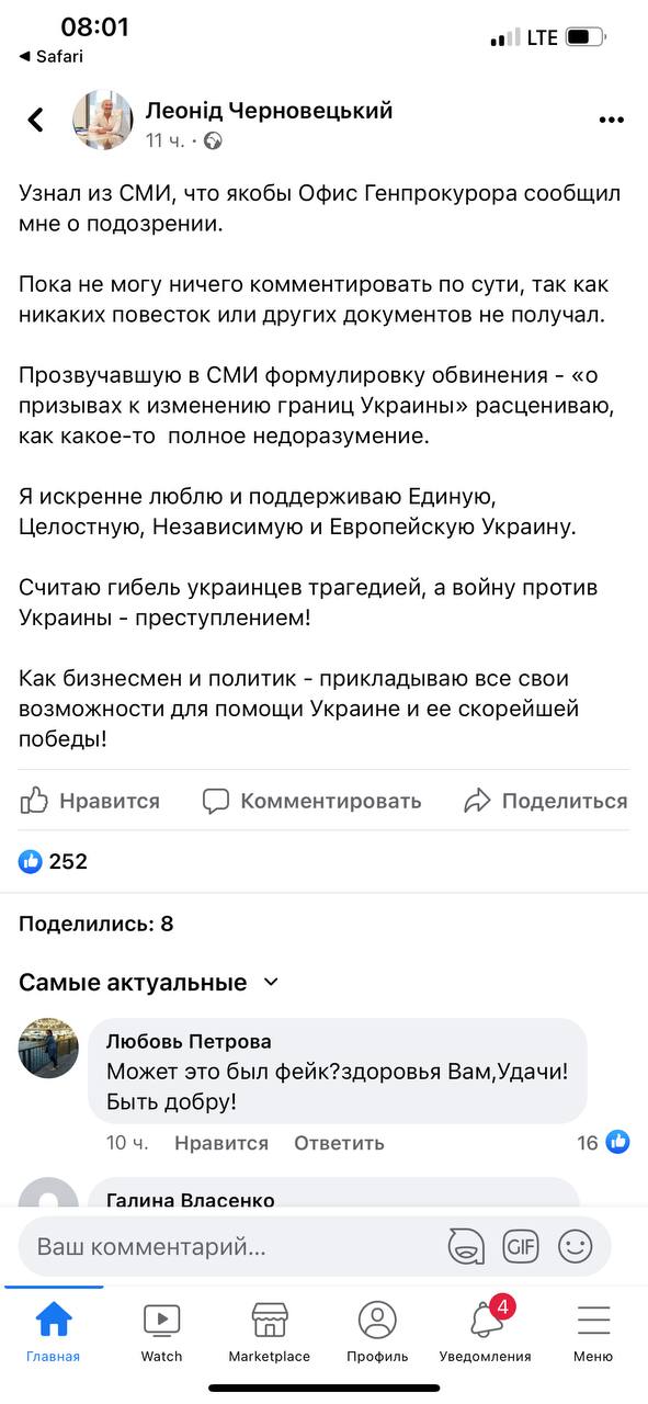 "Узнал из СМИ, что якобы Офис Генпрокурора сообщил мне о подозрении. Прозвучавшую в СМИ формулировку обвинения - "о призывах к изменению границ Украины" расцениваю, как какое-то полное недоразумение. Я искренне люблю и поддерживаю Единую, Целостную, Независимую и Европейскую Украину. Считаю гибель украинцев трагедией, а войну против Украины - преступлением!" - написал Черновецкий.