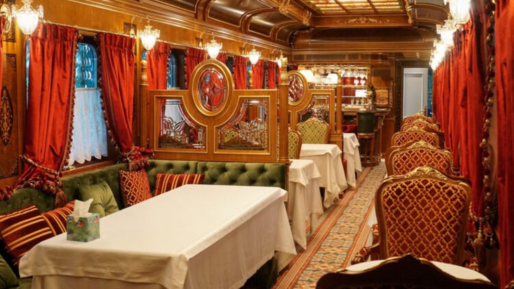 • железнодорожный вагон-ресторан с мебелью и предметами интерьера;