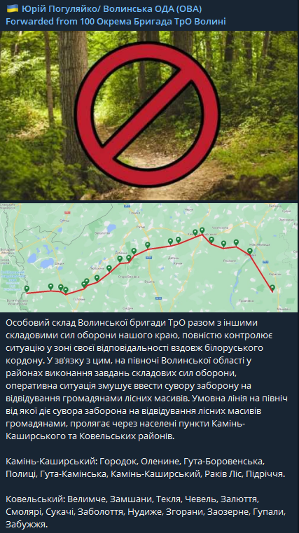 Условная линия, севернее которой действует строгий запрет на посещение лесных массивов гражданами, пролегает через населенные пункты Камень-Каширского и Ковельских районов.