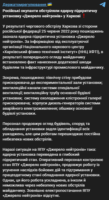 "В очередной раз обращаем внимание, что ЯПУ "Источник нейтронов", как и любая другая ядерная установка, не рассчитана на эксплуатацию в условиях боевых действий. Продолжение бомбардировки и обстрелов площадки могут привести к тяжелым радиационным последствиям с загрязнением прилегающих территорий", - говорится в сообщении.