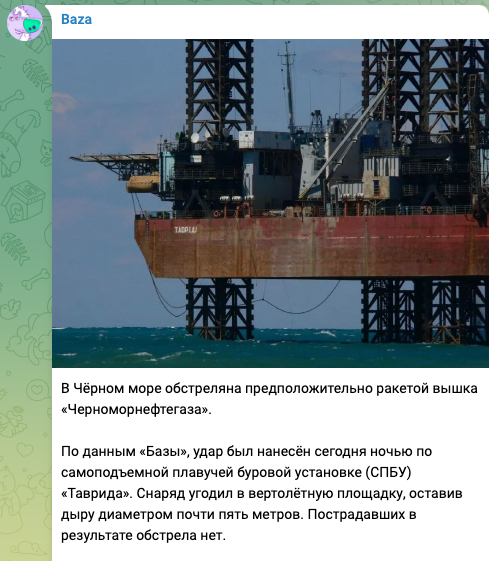 По данным телеграм-канала Baza, удар произошел ночью и пришелся на вертолетную площадку буровой "Таврида".