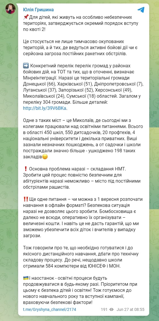 Для детей с особо опасных территорий утверждается отдельный порядок поступления по квоте-2. Квота-2 означает, что абитуриент может поступить в вуз без ВНО - на основе экзаменов. Ранее ее действие распространялось на поступающих из Крыма и с Донбасса.