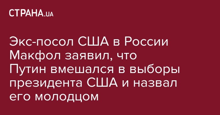 Бывший посол США в России Майкл Макфол высказал мнение, что в процесс выборов президента США вмешался президент России Владимир Путин и сделал это достаточно успешно. Соответствующий пост экс-посол разместил в своем микроблоге Twitter, правда, сразу после этого удалил запись.